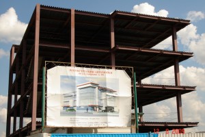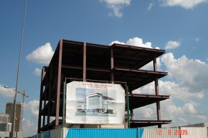 Сразу же после моста Миллениум слева перед домами ЮИТ в 2008-м году мы активно приступили к реализации данного проекта под ключ. Были выполнены демонтажные работы и расчистка территории, земляные и свайные работы с устройством фундаментных стаканов. После выполнения металлического каркаса и перекрытий здания, наступил кризис и в 2009 году проект был заморожен. К сожалению Заказчик достраивал объект до 2011 года самостоятельно.